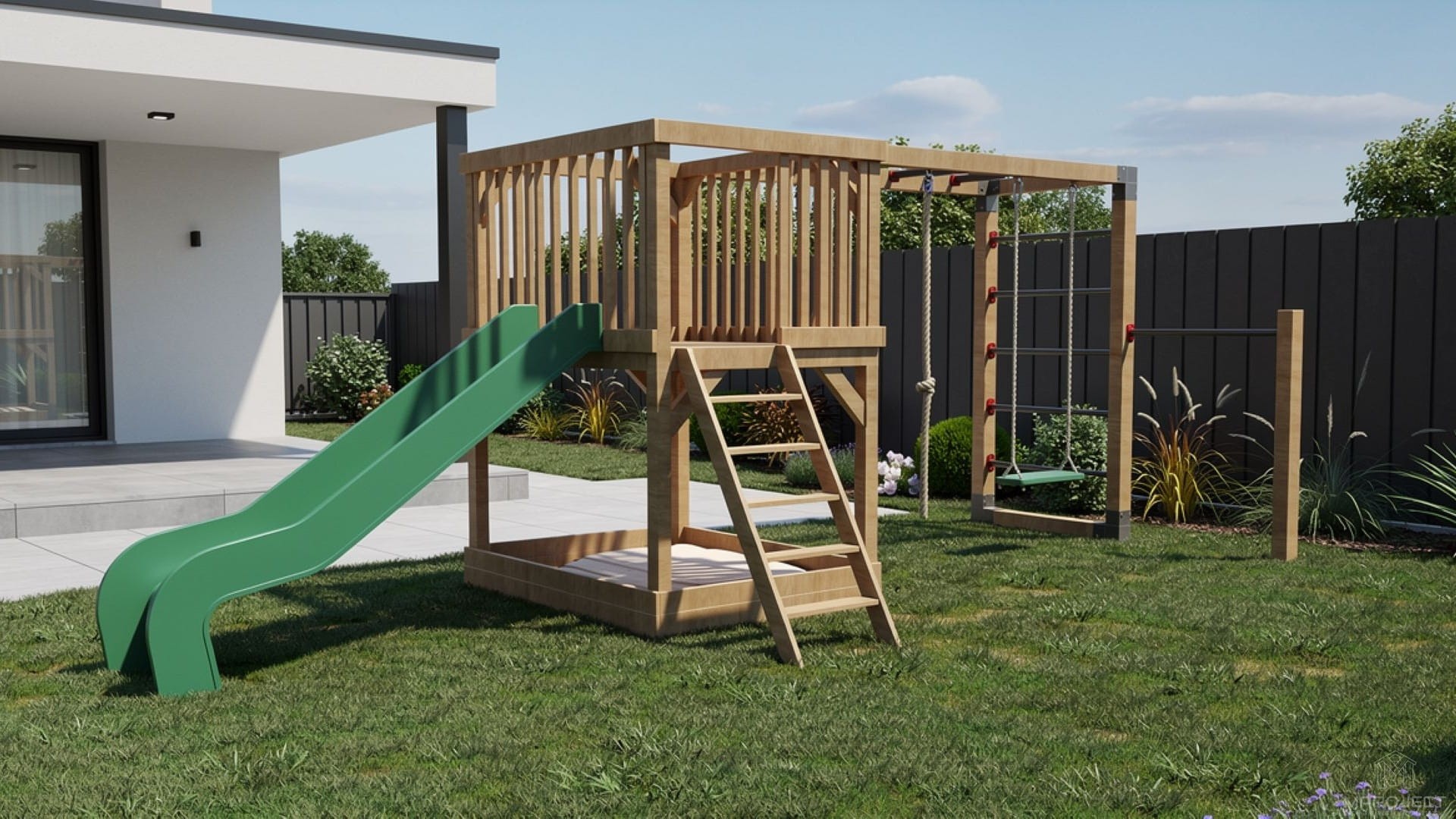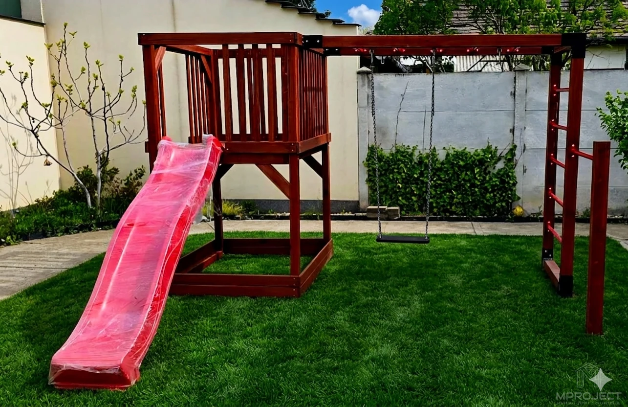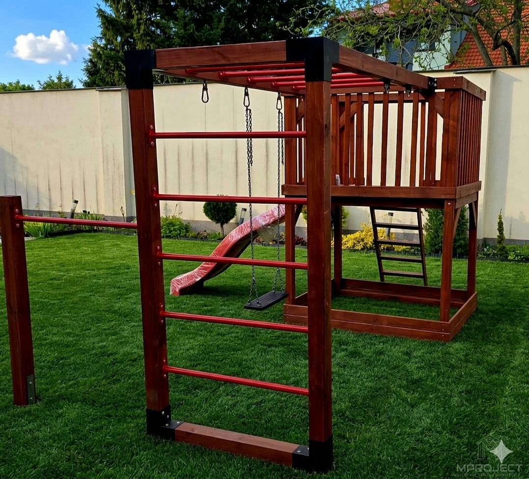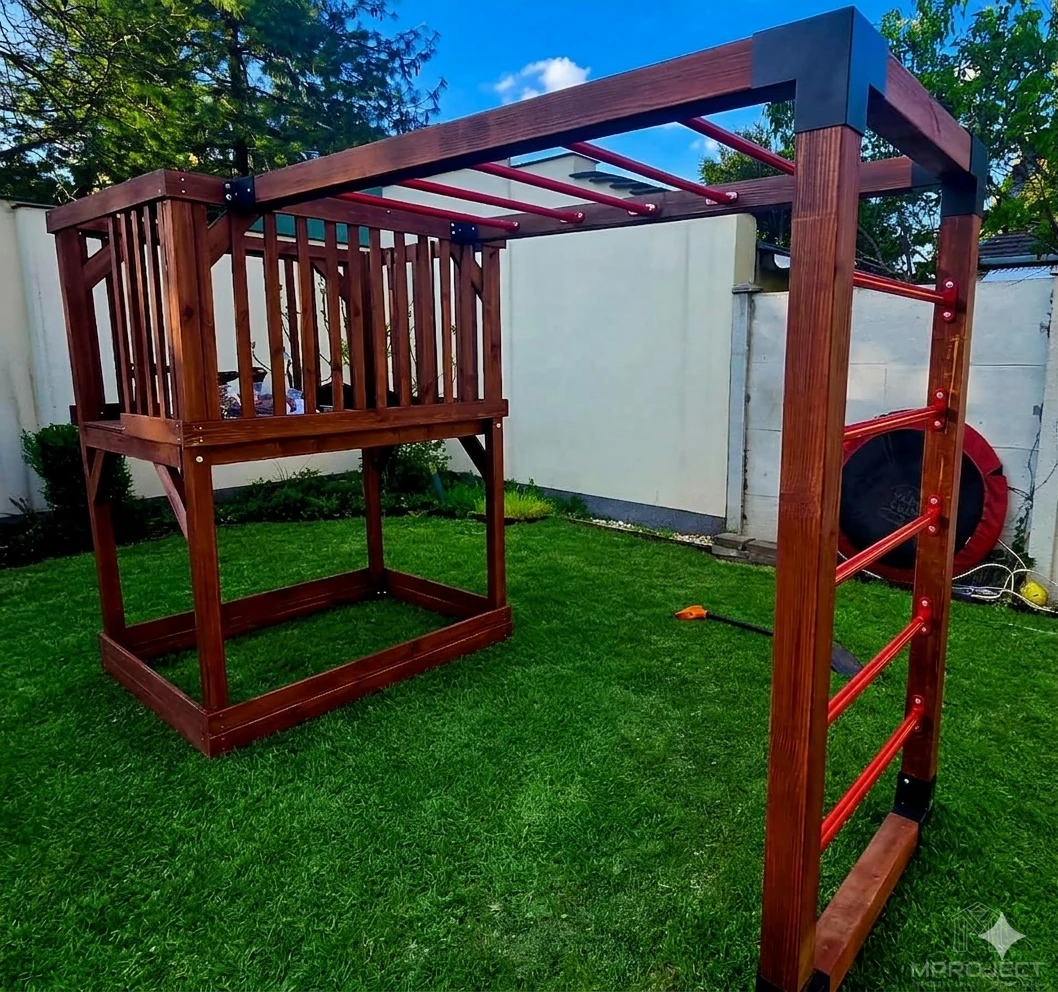 Funkcjonalny i estetyczny plac zabaw wykonany z wysokiej jakości drewna to doskonałe rozwiązanie dla rodzin szukających bezpiecznej i kreatywnej przestrzeni do zabawy w ogrodzie. Zestaw zawiera: zjeżdżalnię, piaskownicę, drabinkę, huśtawkę, kółka gimnastyczne oraz ściankę wspinaczkową. Stabilna konstrukcja i odporność na warunki atmosferyczne gwarantują trwałość na lata.