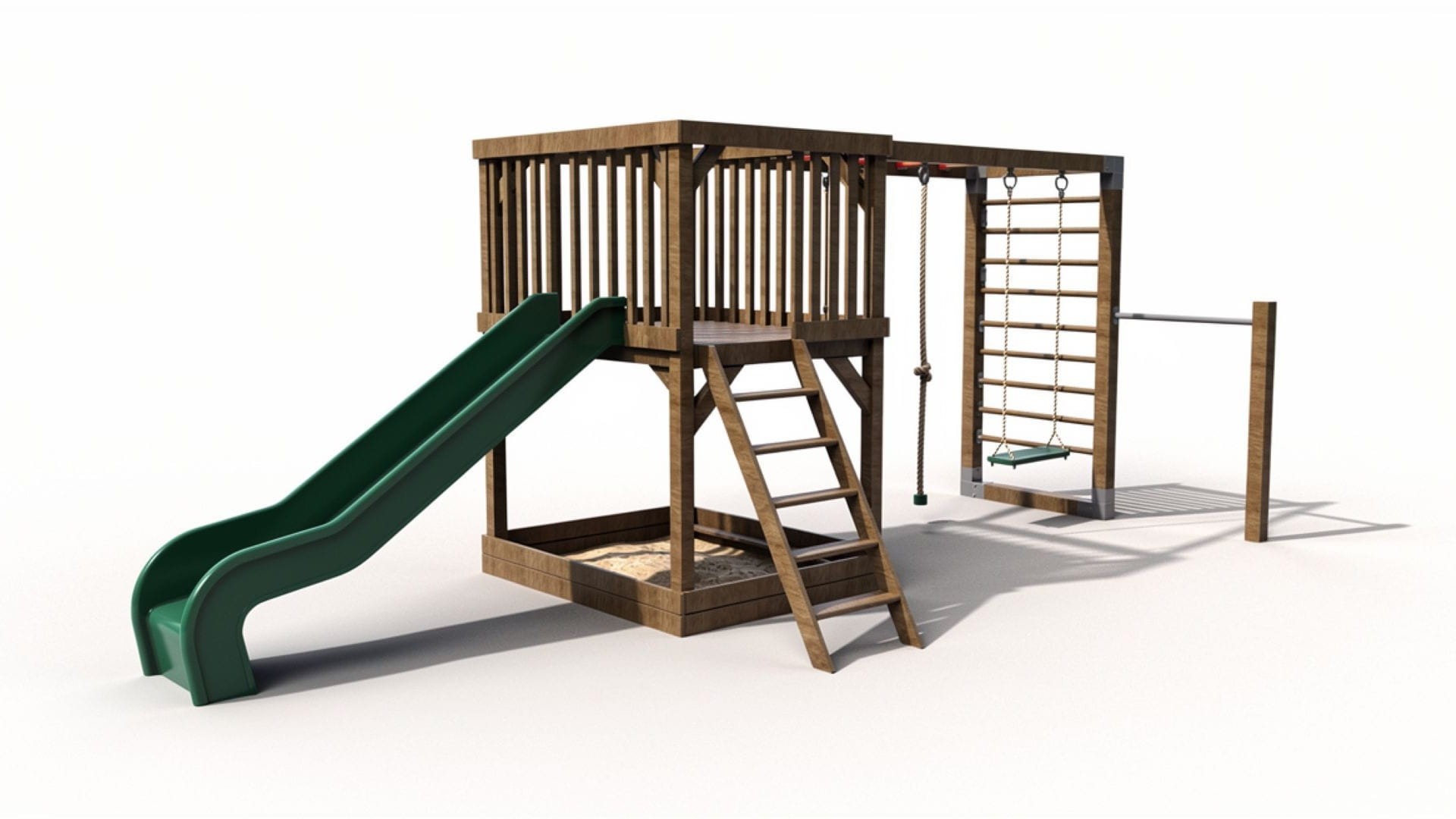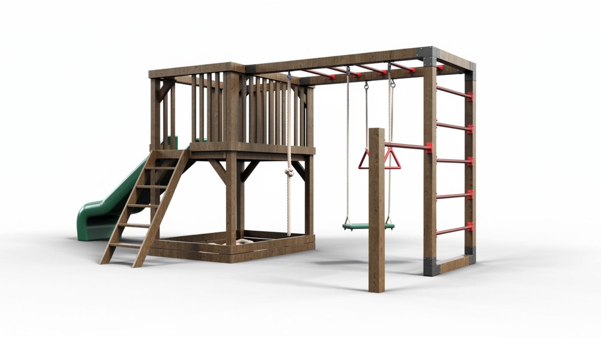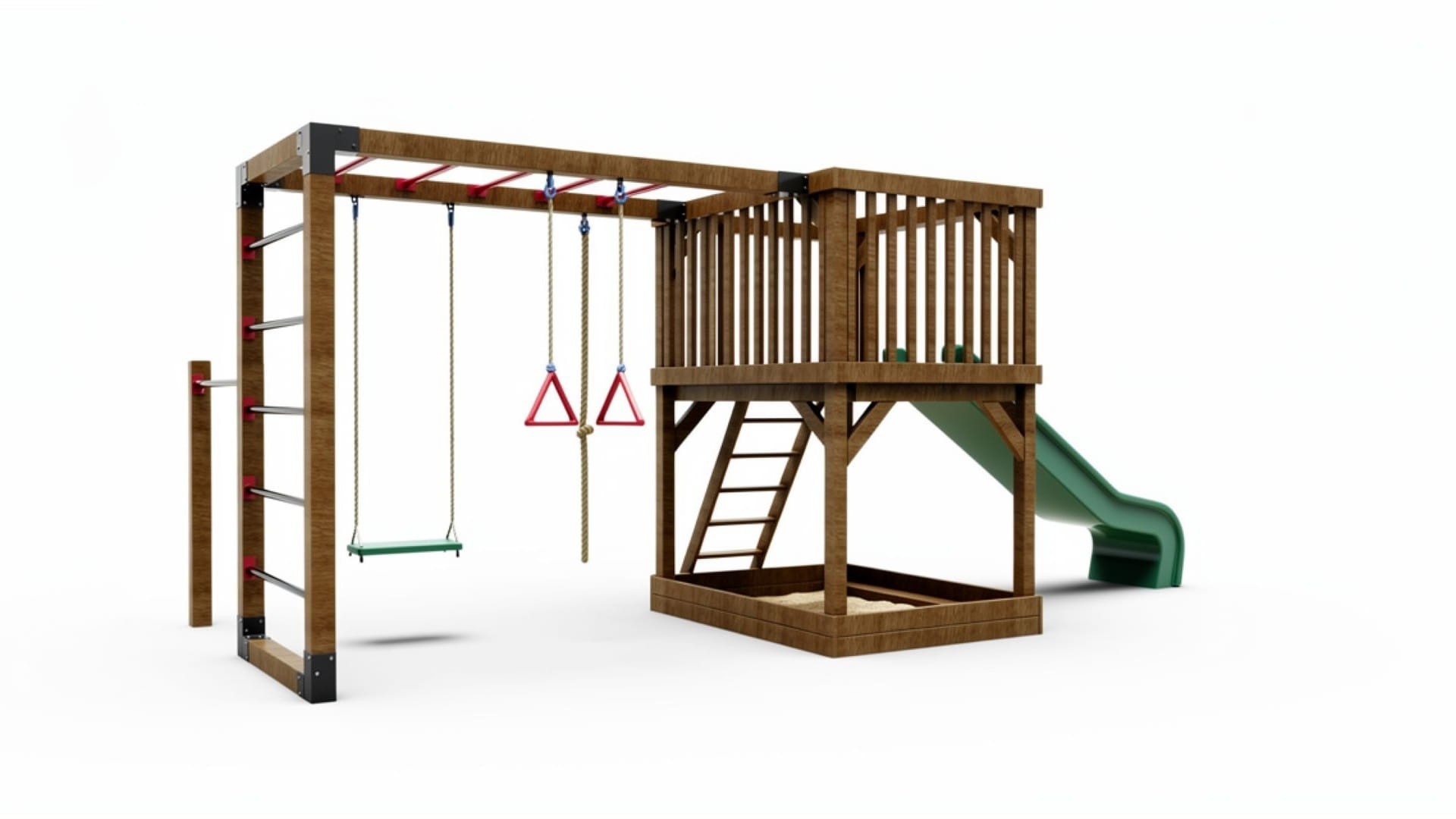 Funkcjonalny i estetyczny plac zabaw wykonany z wysokiej jakości drewna to doskonałe rozwiązanie dla rodzin szukających bezpiecznej i kreatywnej przestrzeni do zabawy w ogrodzie. Zestaw zawiera: zjeżdżalnię, piaskownicę, drabinkę, huśtawkę, kółka gimnastyczne oraz ściankę wspinaczkową. Stabilna konstrukcja i odporność na warunki atmosferyczne gwarantują trwałość na lata.