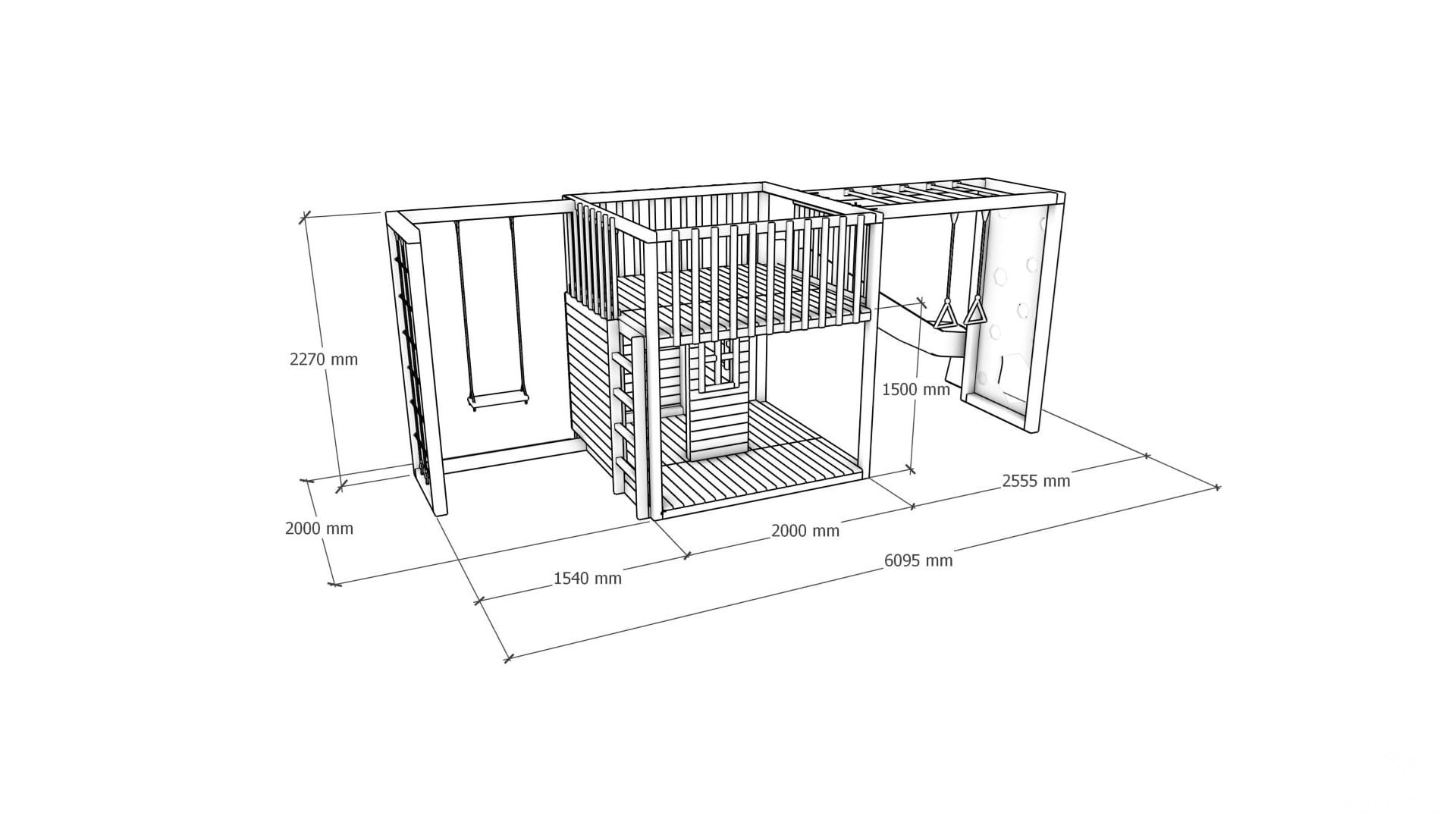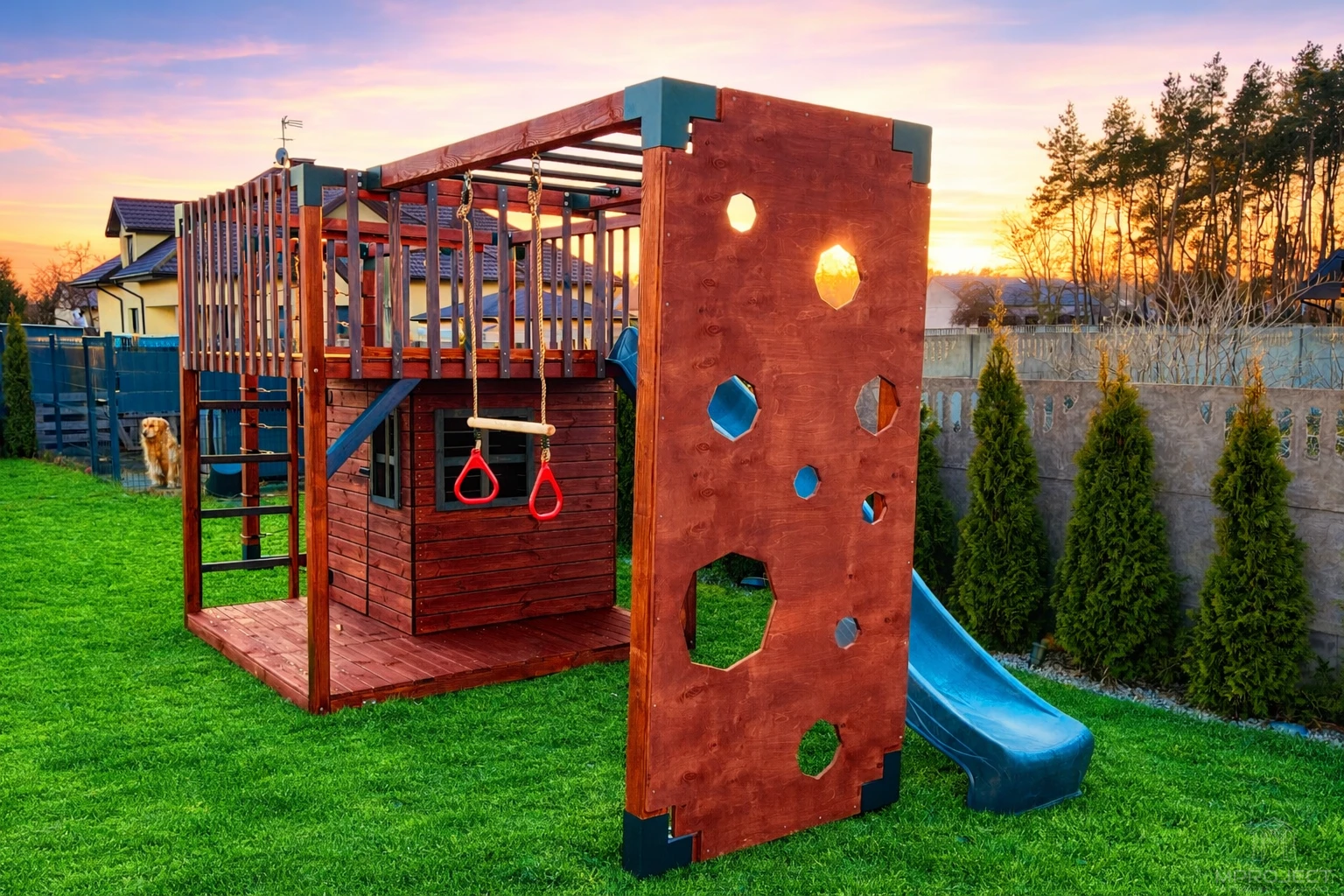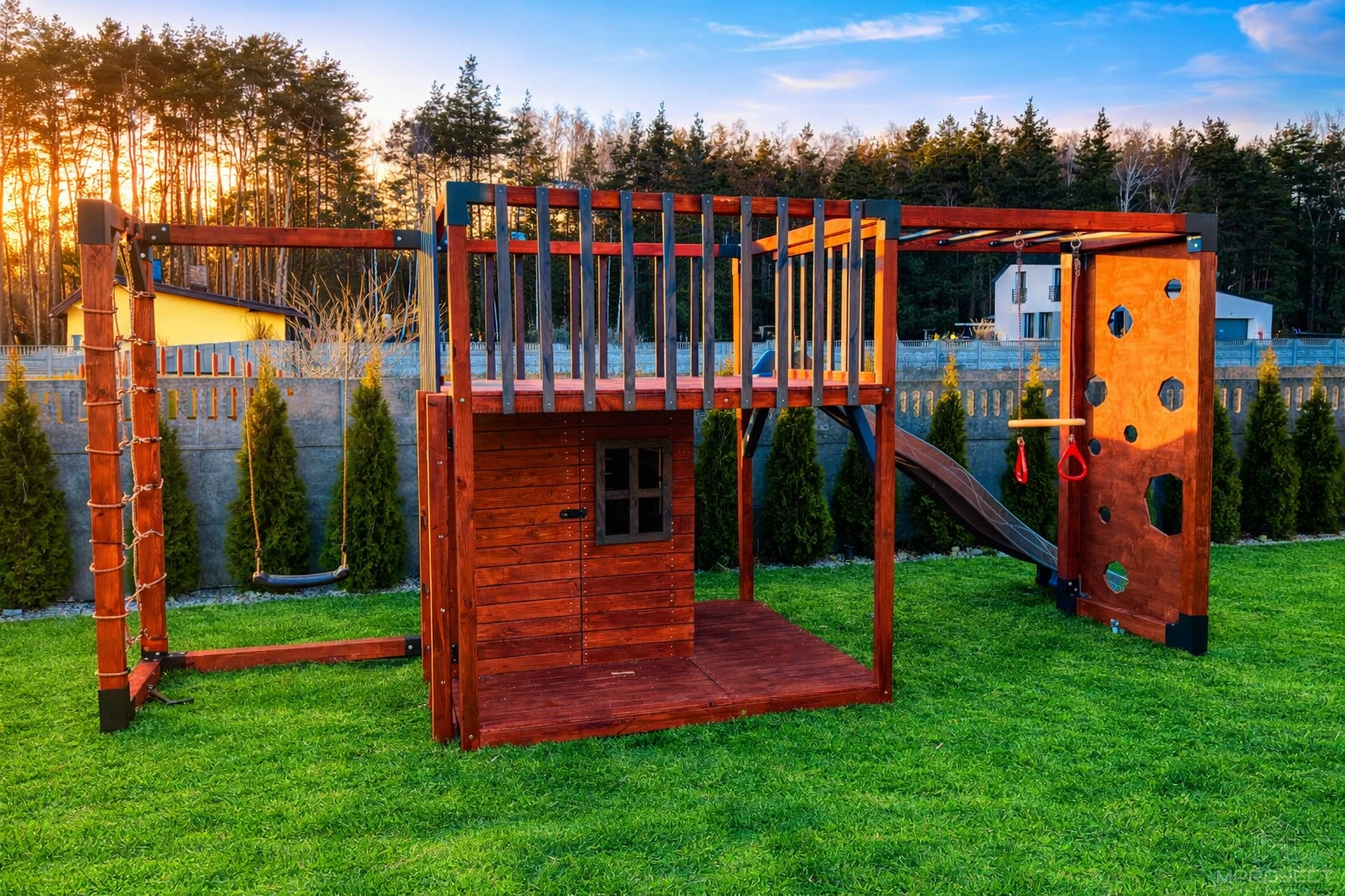 Wielofunkcyjna konstrukcja ze zróżnicowanymi atrakcjami: domek, taras, zjeżdżalnia, ścianka wspinaczkowa, siatka, obręcze, huśtawka i drabinki. Trwałe, bezpieczne i estetyczne rozwiązanie do aktywnej zabawy na świeżym powietrzu.