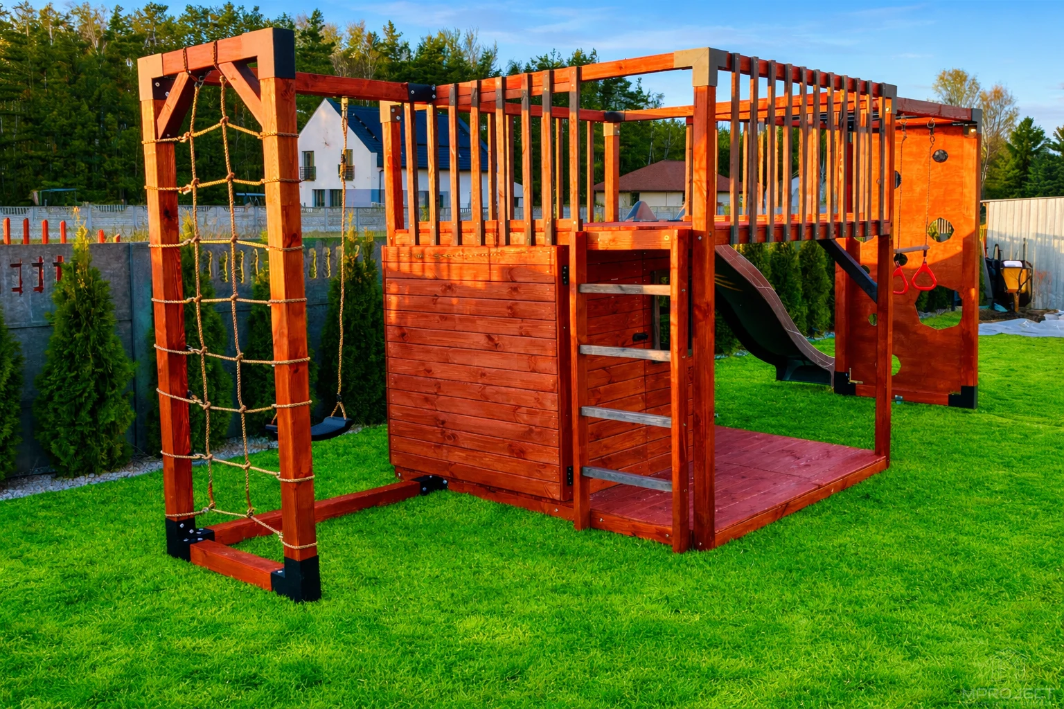 Nowoczesny drewniany plac zabaw dla dzieci z domkiem i tarasem.