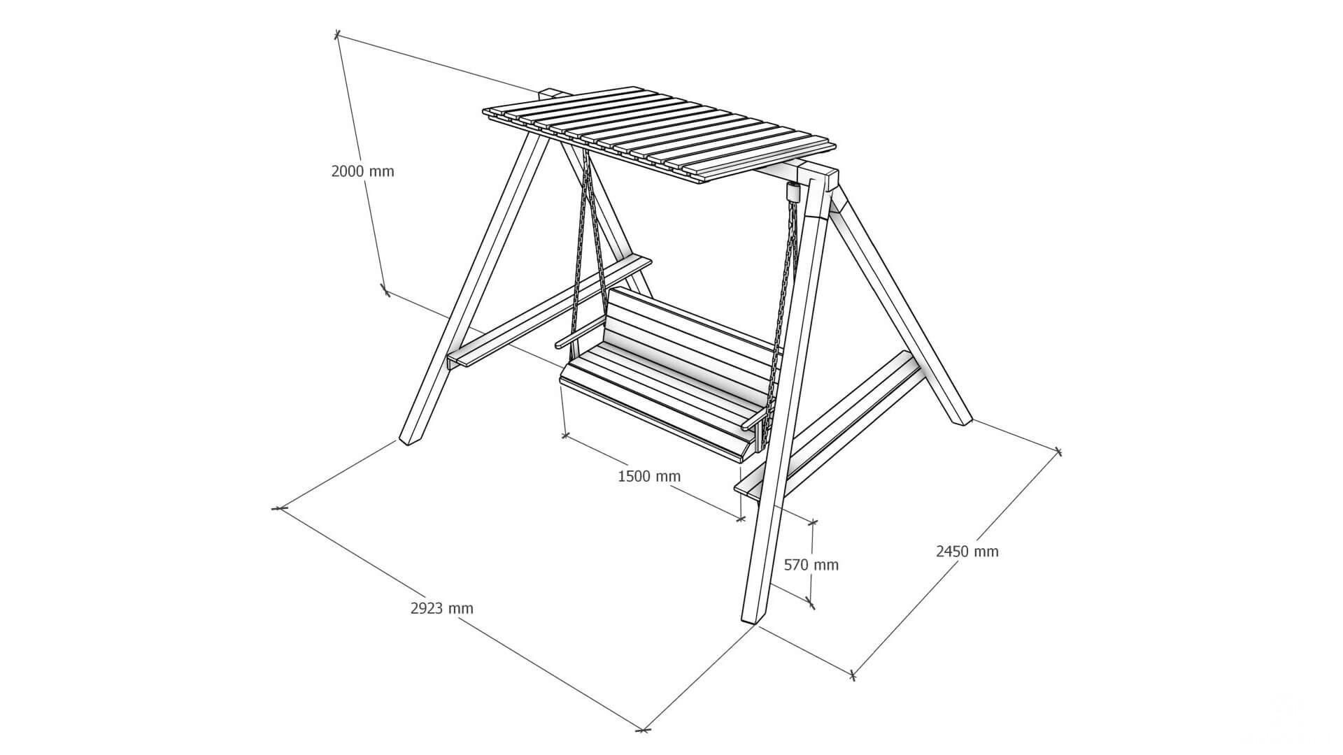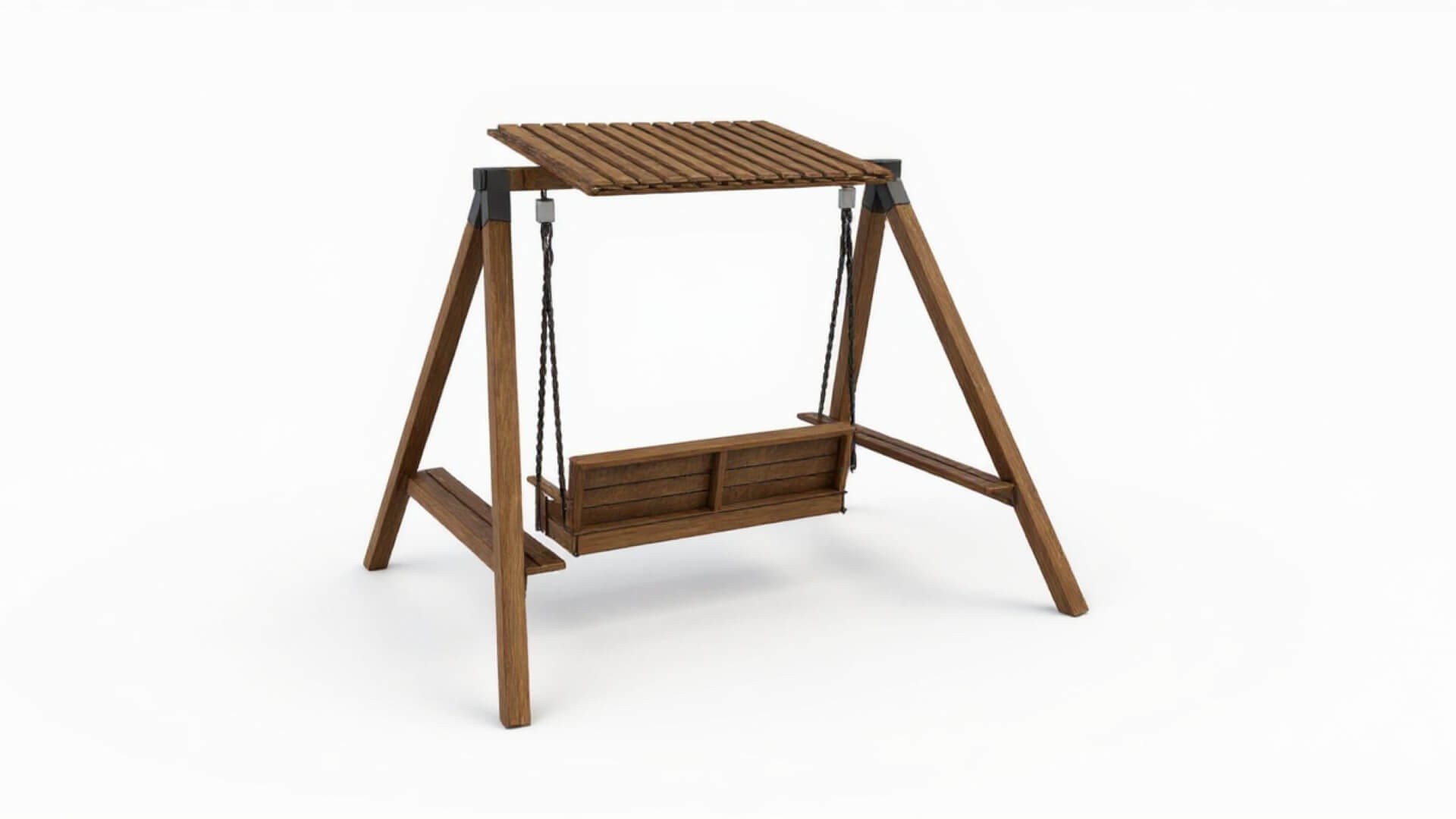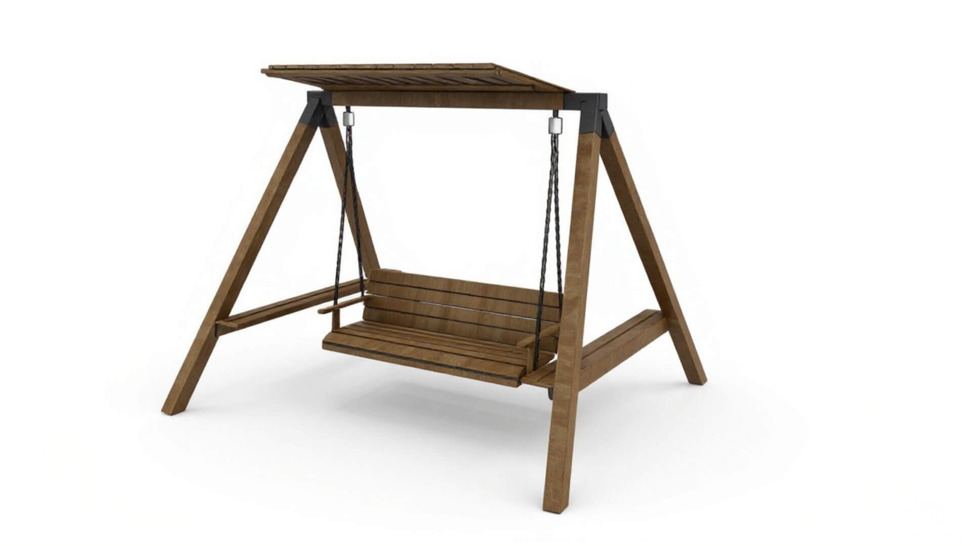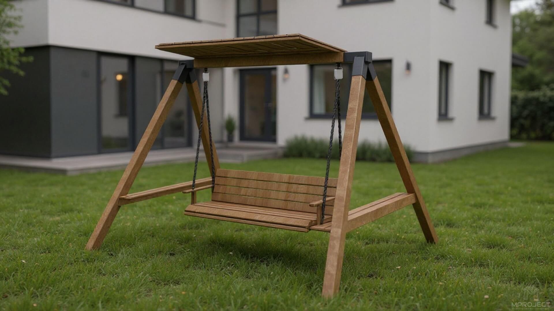Drewniana huśtawka ogrodowa z zadaszeniem - idealna do relaksu wśród zieleni ogrodu.
